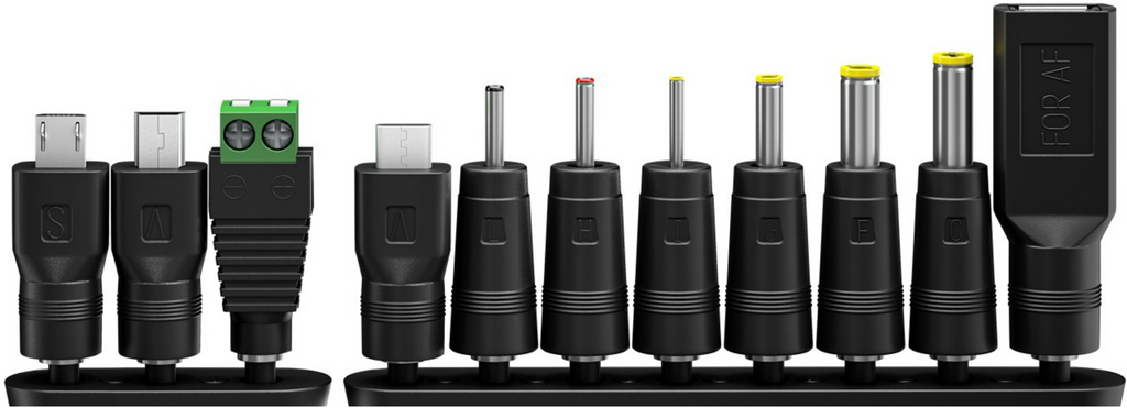 - Inkl. fest verbautem DC-Stecker 5,5 x 2,1 mm und 6 weiteren DC-Adaptern: 5,5 x 2,5 mm, 2,5 x 0,7 mm, 3,0 x 1,1 mm, 3,5 x 1,35 mm, 4,0 x 1,7 mm, 4,8 x 1,7 mm