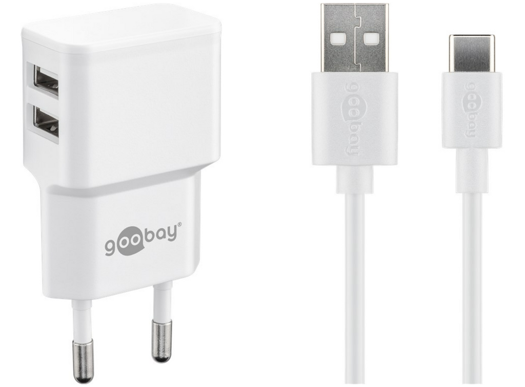 Il set di ricarica Goobay Dual USB-C™ è dotato di un caricatore USB con 2 porte di tipo A e cavo USB-C™ da 1,0 m.